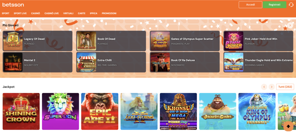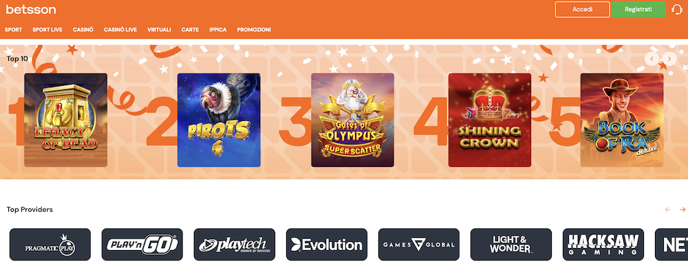 Il sito si presenta in modo piuttosto semplice, con un modello classico e modesto. Ma forse è proprio per questo che riesce a funzionare bene. Nel complesso, infatti, la piattaforma è ben organizzata, con categorie chiare che permettono di trovare facilmente Betsson slot, giochi da tavolo o sezioni live. Discorso analogo per le pagine informative, ma anche per ricercare info specifiche attraverso il footer. Inoltre, vedo dei filtri di ricerca che aiutano a selezionare i titoli preferiti per provider, popolarità o novità.