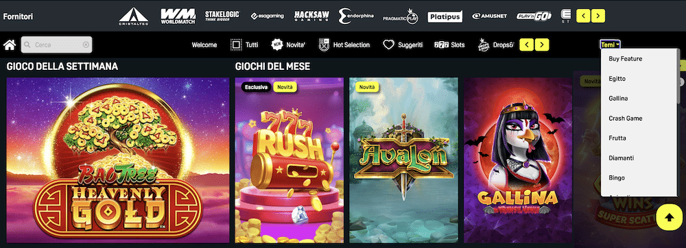- Sotto la categoria Slot invece abbiamo prima di tutto il suggerimento del Gioco della settimana o una selezione delle slot del mese. Poi potrai accedere alla cosiddetta Hot Selection, e ai diversi suggerimenti che il casinò fa per te rispetto anche ai fornitori di software.
