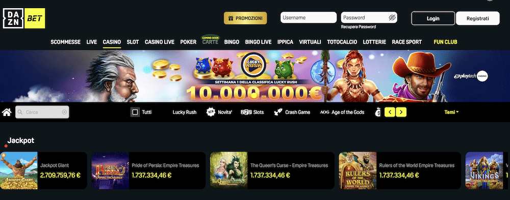 Lucky Rush Playtech è il nome dell’unico altro bonus attivi al momento per il Casinò di DAZN Bet. Dal 29 settembre al 2 novembre puoi partecipare alla promozione che mette in palio 10 milioni di euro in Fun Bonus e 15.000 premiati su base settimanale.